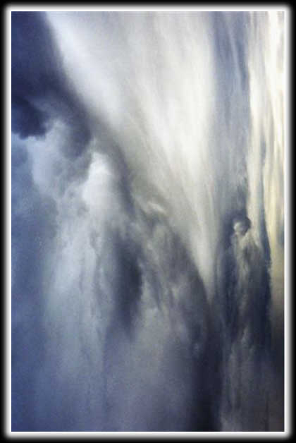 A stunning photo as you see the clouds tranforming into the ultimate image of a verticle angel at the right. His hands are raised and folded in prayer. He is looking to the left (below center) at the dark profile of a woman with her right hand up and touching her head. There is an animal in front of her and (3) angels. |